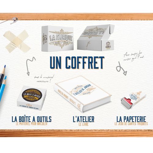 « La fabrique » n’est pas un projet comme les autres. Le livre qui compose ce coffret, L’atelier, est le tout premier manuel de bricolage pour les amoureux de la magie. Des photos en couleur de grande qualité travaillées dans les moindres détails, des schémas étonnants réalisés à la main et une mise en page de type scrapbooking vous permettrons de mieux comprendre toutes les subtilités de la fabrication des gimmicks.