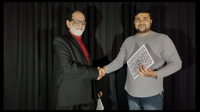 After a little bit of play, the Mentalist reveals the word printed on that piece of paper.