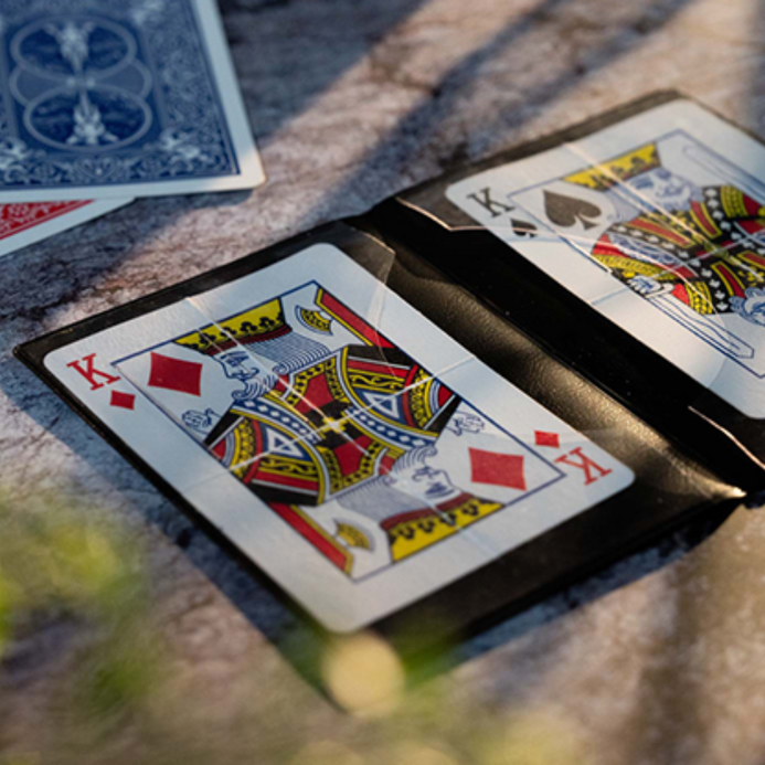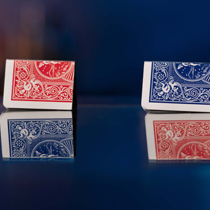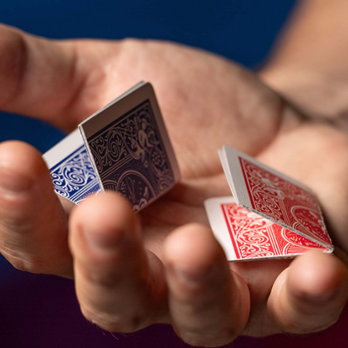 Deux cartes sont retirées d'un petit portefeuille. L'une a un dos rouge et l'autre un dos bleu. Les deux cartes sont pliées en quatre. Rien n'est ajouté ou volé. Vous pliez simplement les deux mêmes cartes. Les cartes sont placées derrière votre dos et mélangées. Le spectateur doit deviner dans quelle main se trouve la CARTE ROUGE et dans quelle main se trouve la CARTE BLEUE. Il ne s'agit évidemment que d'une supposition, car les deux cartes sont cachées dans les mains.