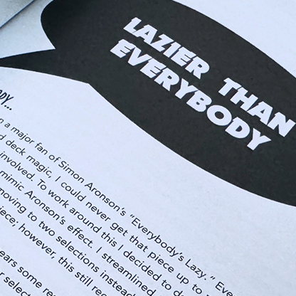 Lazier Than Everybody : une version avec un jeu mélangé du tour « Everybody's Lazy » de Simon Aronson, qui simplifie l'effet et le rend adapté à des répétitions.