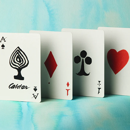 Les cartes à jouer de Calder sont basées sur une série de gouaches vives des années 1970, connue sous le nom de série des joueurs de cartes. De nombreuses cartes sont des reproductions directes de ces peintures, le dos rayé en étant également tiré. Toutes les lettres et tous les chiffres sont écrits de la main de Calder.