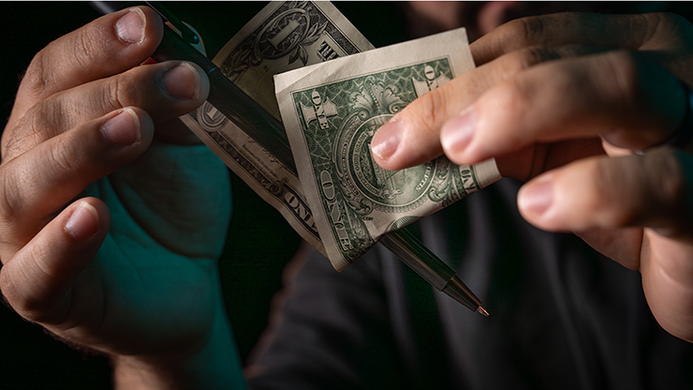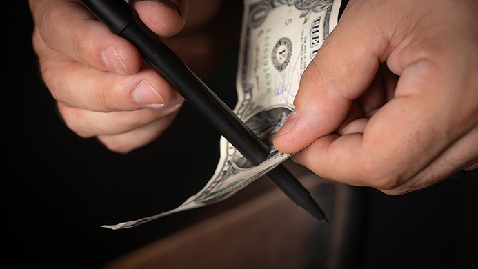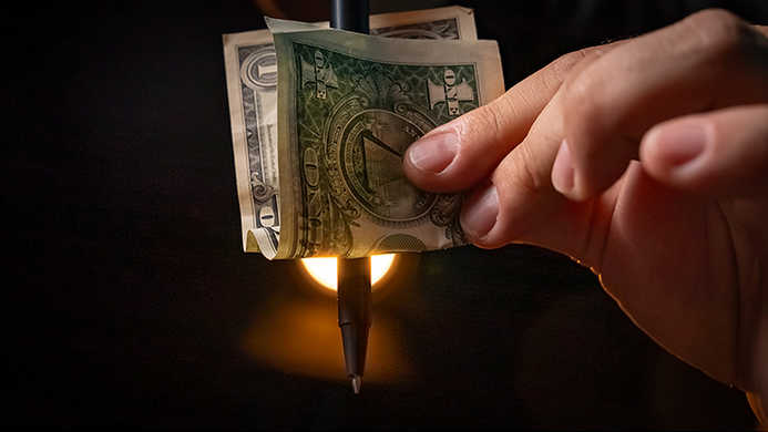 vous empruntez un billet à quelqu'un et, d'un geste rapide, vous enfoncez visuellement un stylo à travers celui-ci...