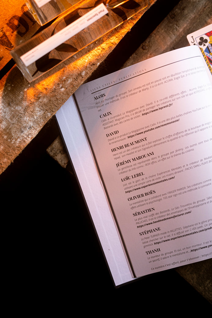 Le groupe des Smart Bastards, créé il y a maintenant quelques années, regroupe 10 magiciens de talent qui échangent continuellement sur leurs trouvailles magiques, et sur leurs idées. Au fil des années, des discussions et des échanges ont permis de coucher sur papier ces idées, et d’élaborer un magazine confidentiel recelant de nombreuses pépites !