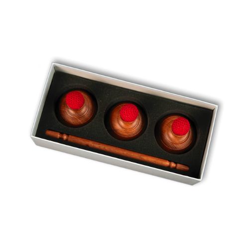 L'ensemble "Indian Cups and Balls" se compose de trois tasses, de six balles en tricot rouge et d'une délicate baguette magique.