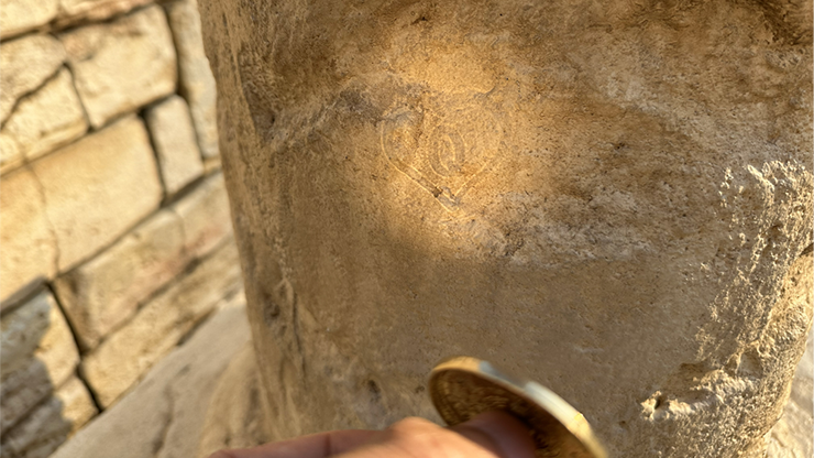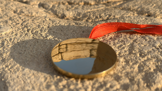 Le magicien présente un miroir en laiton massif, dont la surface est parfaitement propre et réfléchissante.