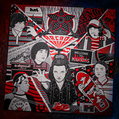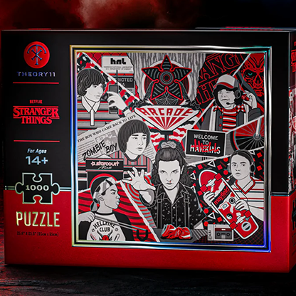 Adapté à partir des illustrations entièrement personnalisées de nos cartes à jouer Stranger Things, ce puzzle de 1 000 pièces donne vie aux personnages emblématiques et aux références de la série avec un niveau de détail saisissant. Les pièces du puzzle sont recouvertes d'une feuille holographique rouge et argentée et sont livrées dans une pochette de transport haut de gamme.