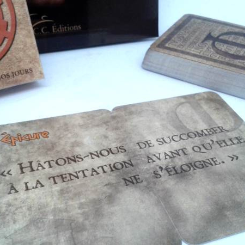 Il s’agit d’un jeu de cartes oraculaires comme ceux que l’on peut trouver dans les boutiques et librairies ésotérique. Il est constitué de deux paquets de vingt-six cartes se complétant afin de pouvoir présenter autant de citations de philosophes différents.