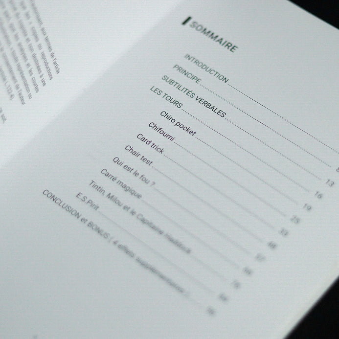 - Un livre avec de nombreux effets de mentalisme : Chair test, which hand, Free will, divinations, coïncidences, effets impromptu avec objets du quotidien (pièces, cartes de visite...), carré magique, tour de scène, etc.
