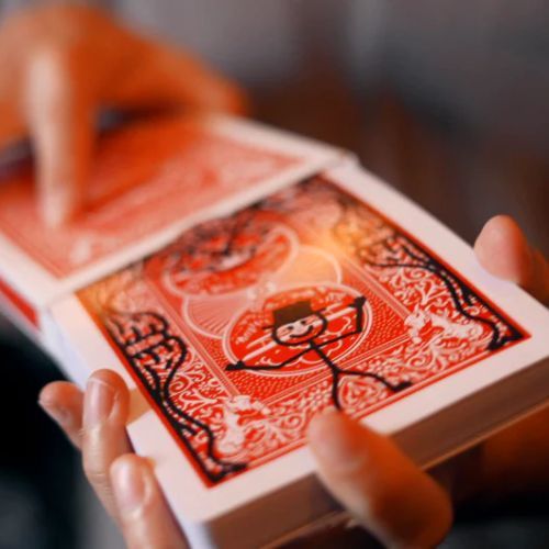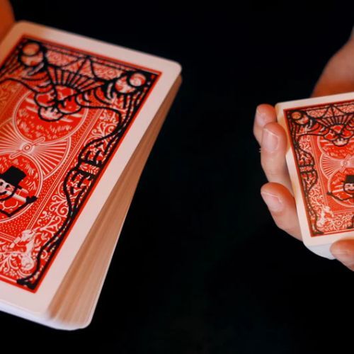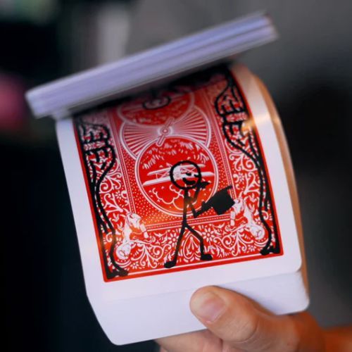 Vous introduisez un jeu de cartes de taille jumbo avec des dessins au dos. Les dessins représentent un charmant petit bonhomme allumette debout sur une scène. Vous montrez que chaque carte est juste un peu différente, et si vous feuilletez le jeu, les dessins deviennent un flip book d'un magicien exécutant un tour. Les dessins s'animent, montrant le magicien enlevant son chapeau, atteignant l'intérieur, puis sortant un lapin. Demandez à votre public de nommer n'importe quelle carte. Cette carte est retirée de la pioche et mise de côté. Vous montrez à nouveau le dos du jeu et affichez l'animation une fois de plus. Cette fois, lorsque vous retournez tout le jeu, le magicien ne se contente pas de sortir le lapin du chapeau.