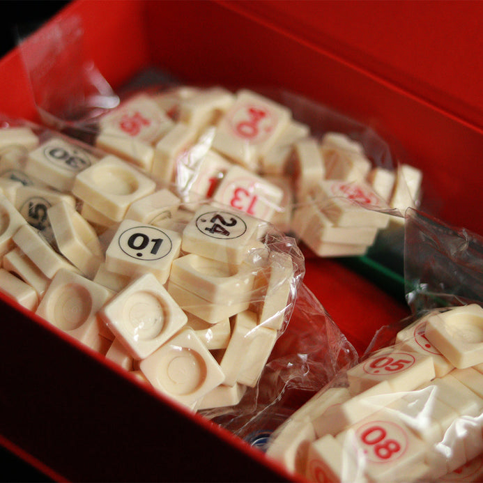 Le matériel se présente sous la forme d’un jeu familial avec des chiffres de type Bingo ; de simples petits carrés en plastique sur lesquels sont imprimés des nombres de 1 à 99.