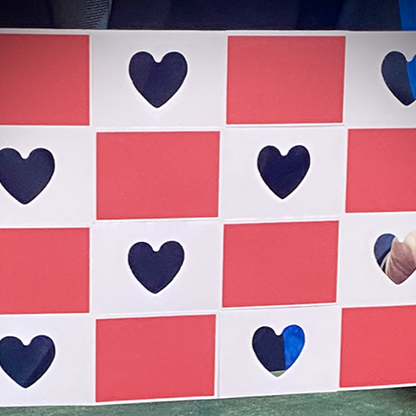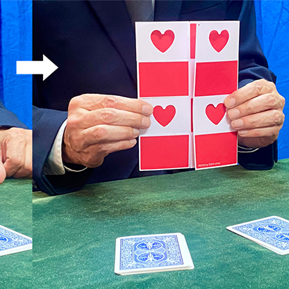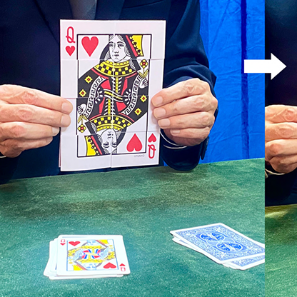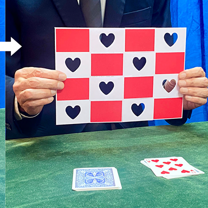 Le magicien retire un petit paquet de cartes du jeu et les mélange. Il les distribue en deux piles, en demandant à un spectateur de l'interrompre à tout moment. Les cartes qui se trouvent sur le dessus des deux piles deviennent deux sélections, une pour chaque spectateur. L'une est le huit de cœur, l'autre la reine de cœur, mais le magicien ne le sait pas. Chaque spectateur regarde sa sélection et s'en souvient. Le magicien sort une feuille de papier colorée de carrés rouges et blancs, et percée de trous en forme de cœurs. Après avoir montré les deux faces du papier, il explique qu'il devinera les deux cartes auxquelles le spectateur pense. Il plie le papier et montre deux cœurs en demandant au premier spectateur : « Est-ce votre carte ? Il répond : « Non ». L'artiste replie le papier pour afficher quatre cœurs et le montre à nouveau au spectateur en lui disant : « C'est votre carte, le quatre de cœur ? « Non », répond le spectateur. « Je vous en prie, essayez une dernière fois. Quel était le nom de votre carte ? » Le spectateur répond : « Le huit de cœur ». L'artiste ouvre le papier et révèle un huit de cœur. Tout aussi rapidement, il ouvre complètement le papier et le huit de cœur disparaît. Il se tourne alors vers la deuxième spectatrice et lui demande de nommer sa carte ; elle répond « La Reine de Cœur ». Il plie le papier et, en un clin d'œil, la Reine de Cœur y apparaît comme par magie. D'un autre coup, le papier est ouvert et montré des deux côtés - la Reine de Cœur a disparu, et le papier est exactement comme il était au début.