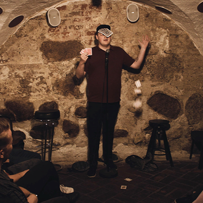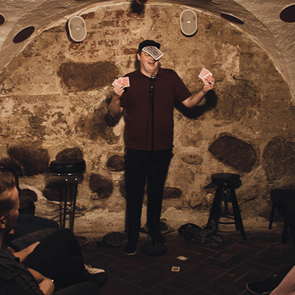 Vous placez une carte jumbo face cachée dans un endroit bien visible du public. Un jeu de cartes normal est ensuite distribué pour être mélangé librement. Ensuite, un ou plusieurs membres du public vous aident à éliminer les cartes jusqu'à ce qu'il n'en reste plus qu'une. Chaque décision qu'ils prennent est un choix totalement libre. Pourtant, d'une manière ou d'une autre, la dernière carte restante correspond à votre prédiction.
