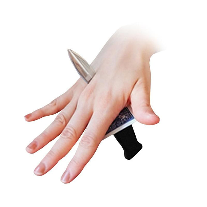 La main peut être montrée des deux côtés et le couteau, qui est coincé dans la paume, sera clairement vu sortant de l'arrière. Le magicien enlève le couteau et en montrant la carte qui est celle choisie, il montre sa main des deux côtés sans aucune marque.