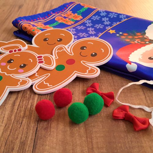 Montrez un ou les deux personnages comme étant des biscuits non décorés. Placez le personnage dans le foulard plié, ajoutez des "boutons" (pompons rouges et verts) et du "glaçage" (ric rac blanc). Faites votre magie et montrez que le personnage en pain d'épices est devenu magiquement décoré !