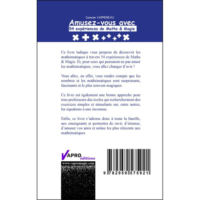 "Amusez-vous avec 54 Expériences de Maths & Magie" est un livre ludique qui vous propose de découvrir les mathématiques à travers 54 expériences de Maths & Magie. Et, pour ceux qui pensaient ne pas aimer les mathématiques, vous allez changer d’avis !