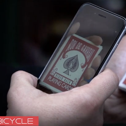 Les concepteurs jouent également avec les célèbres paquets de cartes Bicycle, qui servent de support pour un tour de magie interactif avec cette application. Une carte est choisie et perdue dans le paquet. Le magicien fait alors remarquer qu’il utilise des paquets de cartes normaux et connus par les joueurs de poker, les célèbres Bicycle. L’appareil photo du téléphone portable ou du smartphone est alors déclenché et à l’intérieur on y voit apparaître le paquet de cartes. Mais surprise : le mot Bicycle se change en la valeur de la carte. Plus fort encore : c’est le paquet lui-même qui, dans la réalité, se transforme et porte désormais le nom de la carte du spectateur !