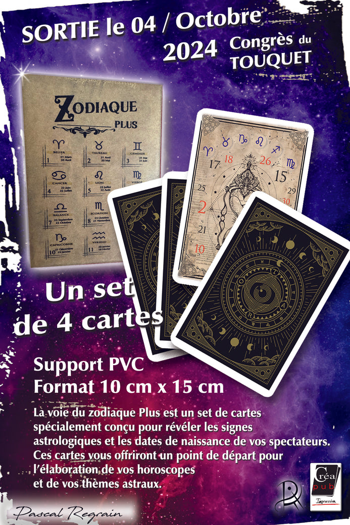 Zodiaque Plus est un jeu de cartes spécialement conçu comme la Voie Du Zodiaque, pour révéler les signes astrologiques et les dates de naissances de vos spectateurs, toutefois celui-ci se compose de quelques cartes seulement et est au format JUMBO (grande taille).