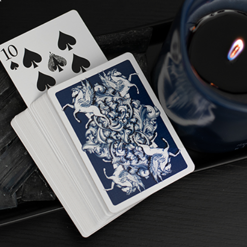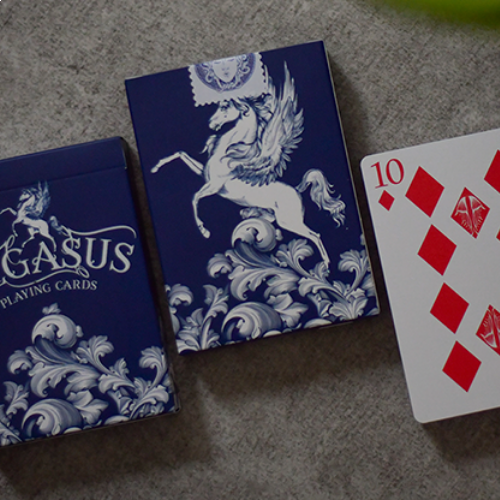 Conçu par Drew Hughes, le jeu Pegasus a des illustrations 100 % personnalisées. Le motif du dos présente Pégase parmi les nuages dans une illustration finement détaillée. Les Valets représentent Bellerophon (le cavalier de Pégase), avec Poséidon pour les Rois et Athéna pour les Reines. Les Jokers diptyques se combinent pour créer une image singulière de la Chimère !