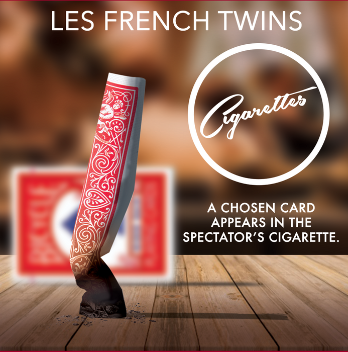 La carte disparaît visuellement ! Maintenant… sur le bout des doigts et sans rien cacher, le spectateur ouvre la cigarette par lui même. IL Y A UNE CARTE A L’INTERIEUR ! C’est le reste de la carte signée du spectateur ! La carte est offerte en souvenir !