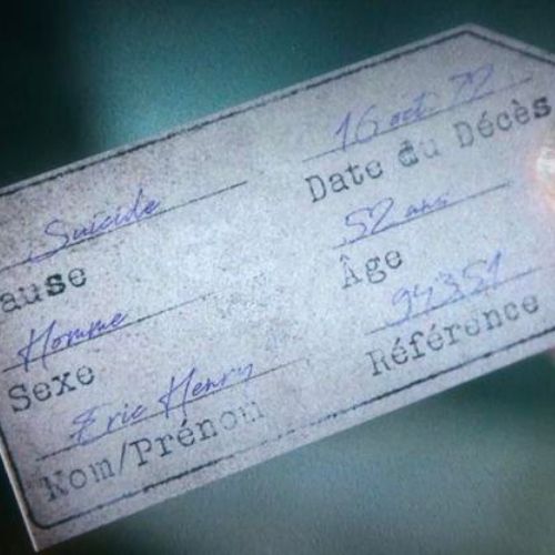 Vous présentez les étiquettes d’une morgue (celles accrochées aux orteils des défunts) de 1972, ainsi que des documents du crématorium Muller à votre public. Votre spectateur choisi l’étiquette de son choix, vous êtes ensuite capable de révéler le nom, le sexe, l’âge de la personne lors de son décès, la raison de sa mort etc.