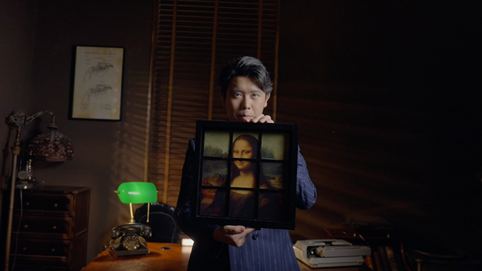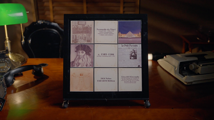 Tout en racontant l'histoire de La Joconde, l'artiste demande à un membre du public de placer librement les tuiles d'information dans les fenêtres ouvertes d'un cadre à neuf panneaux, dans n'importe quelle position ; il peut même changer la position des tuiles à tout moment !
