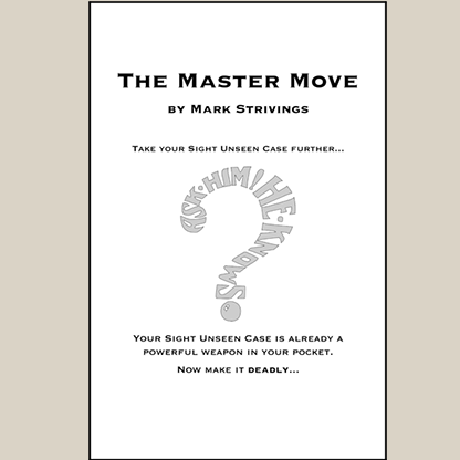 Possédez-vous un « Sight Unseen Case » ? Si oui, vous devez absolument apprendre « The Master Move ». Dans ce petit ouvrage concis mais riche en contenu, vous trouverez le secret d’une manœuvre qui permet de réaliser des miracles d’une ampleur incroyable. Comme vous l’avez déjà lu plus haut, c’est du matériel de premier ordre. Vous apprendrez les bases de toute la manœuvre en cinq minutes environ, mais les miracles que vous réaliserez grâce à elle vous laisseront des souvenirs inoubliables.