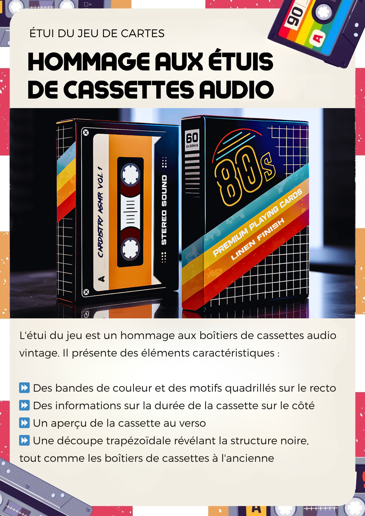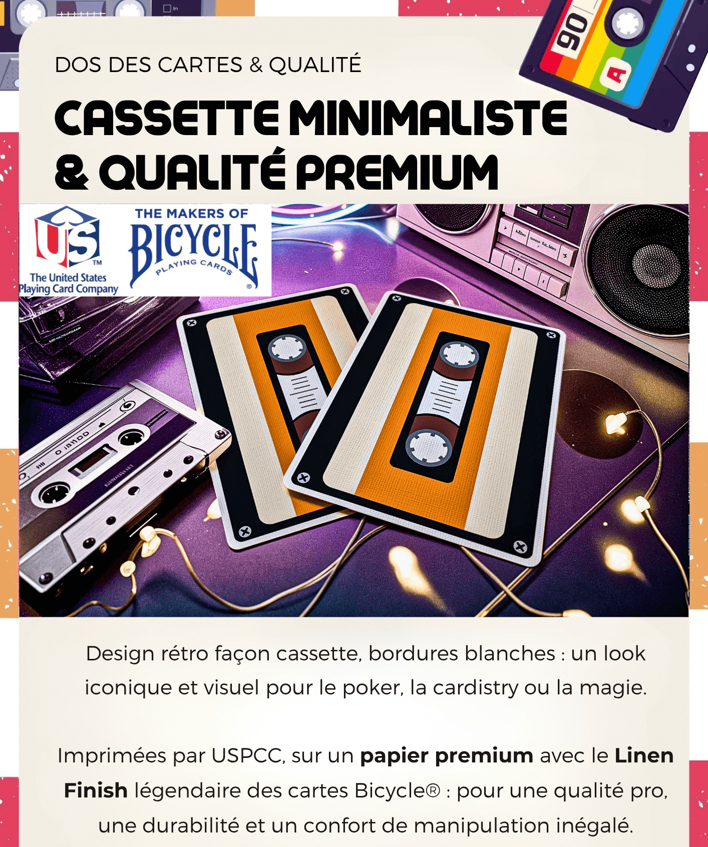 Design rétro façon cassette, bordures blanches : un look iconique et visuel pour le poker, la cardistry ou la magie.
