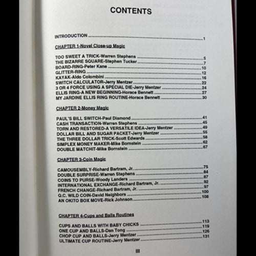 195 pages, relié, 7 par 10 pouces, Une grande collection de magie sans cartes à jouer. Des routines utilisant des billets, des pièces de monnaie, des gobelets et des balles, le jeu du coquillage, des routines de saut de table et de la magie avec des objets divers. Des collaborateurs de renommée mondiale.