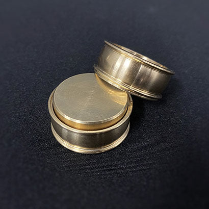 Laissez votre spectateur assembler deux anneaux de laiton et un bloc de laiton massif en un seul tube. Quatre pièces sont placées dans le tube et sont empêchées de le traverser par le morceau de laiton qui en bloque le centre. Mais à votre ordre, les pièces passent, une par une, à travers le laiton massif et dans la main du spectateur ! Enfin, vous pouvez démonter le tube pour produire un lingot d'or, un cube, une boule d'éponge ou d'autres petites choses.