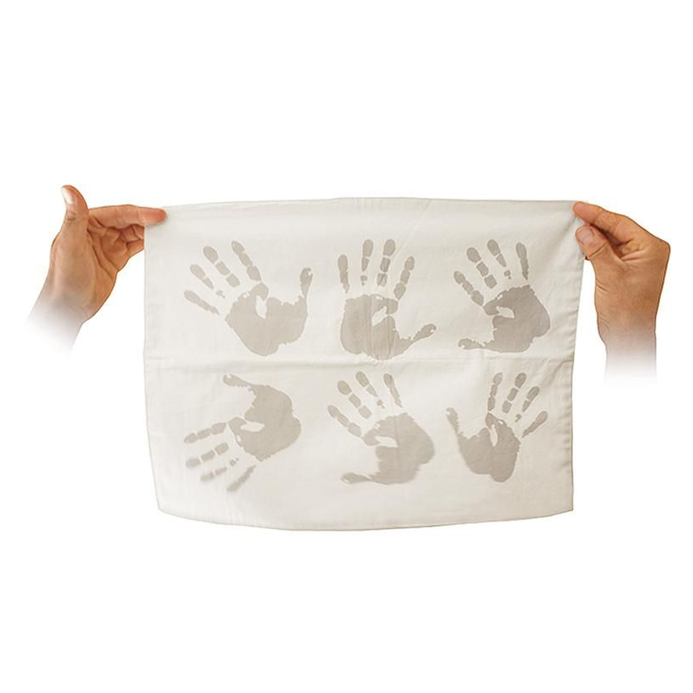 Il demande à l'enfant de s'essuyer les mains avec, puis, après un moment, montre que des traces de mains sales sont maintenant apparues sur le chiffon.
