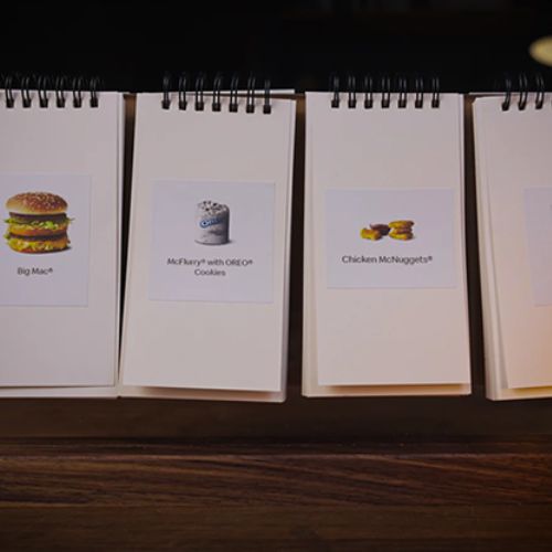Quatre membres du public feuillettent chacun une section au hasard. Chaque participant choisit un aliment différent. Le déjeuner du magicien dans la boîte correspond parfaitement aux aliments choisis au hasard par le public. Ce n'est pas seulement la capacité de prédire des cartes à jouer ou de la nourriture, c'est la liberté totale de prédire tout ce que l'on peut imaginer.