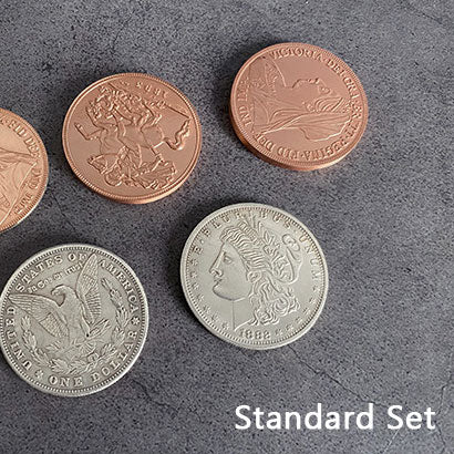 Deux pièces de monnaie sont montrées, un dollar Morgan et une pièce ancienne britannique. L'une des pièces de monnaie est déposée dans votre poche et réapparaît immédiatement dans votre main. L'autre pièce de monnaie est placée dans votre poche et elle revient également dans votre main. L'effet se répète à nouveau et finalement, quand le pauvre spectateur est sur le point d'abandonner, vous ouvrez votre main et surprise, tout a disparu !