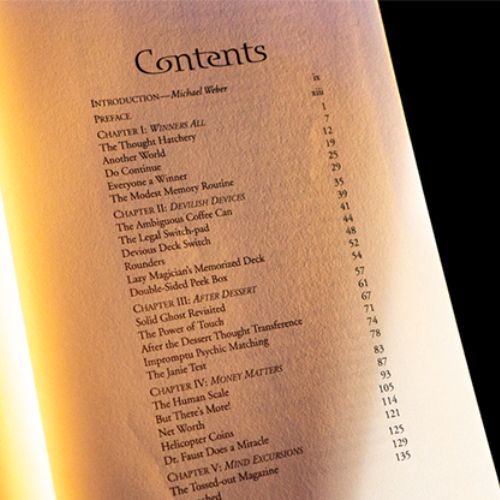 - Sont également inclus trois nouveaux changes de jeux, effectués en position debout, qui ne nécessitent aucun tour de manipulations ni utilisation de poches; un jeu qui se démélange en secret après avoir été mélangé par un spectateur ; et bien d'autres mystères utilisant des pièces de monnaie, des billets, des magazines, des billes, de la corde et plus encore !