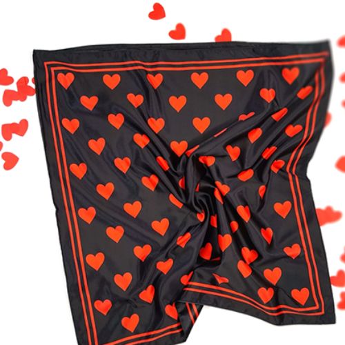 Un bandana noir avec un motif de cœur rouge vif et une bordure assortie est montré des deux côtés.