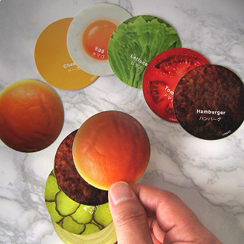 Cette astuce amusante utilise des cartes rondes qui montrent les ingrédients nécessaires pour faire un hamburger appétissant.