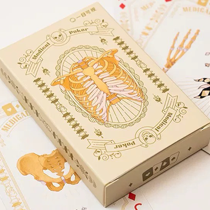 Les cartes représentent diverses structures anatomiques, telles qu'une cage thoracique sur la boîte et un crâne sur la carte Joker. Le design intègre des images médicales à des éléments traditionnels des cartes à jouer.