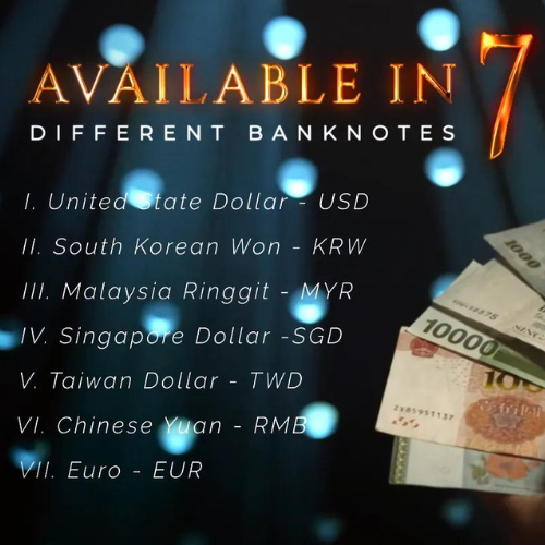 REMARQUE : la monnaie présentée dans la bande-annonce correspond aux billets de banque disponibles. Par exemple, l'euro nécessite un billet de 10 euros, tandis que le dollar correspond à un billet de 1 dollar.