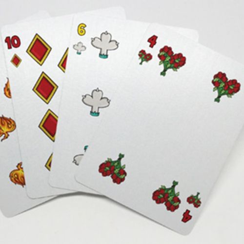 Les piques sont désormais représentés par des flammes. Les pattes de M. Piffles ont remplacé les trèfles. Les cœurs ne sont plus représentés, les fleurs le sont, et les diamants... ok, les diamants sont toujours les mêmes, mais en plus chic.