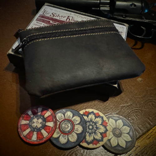 Utilisant des accessoires de style Old West, il est maintenant présenté dans un superbe coffret, un nouveau portefeuille en cuir plus grand et quatre superbes jetons de poker imprimés sur mesure !