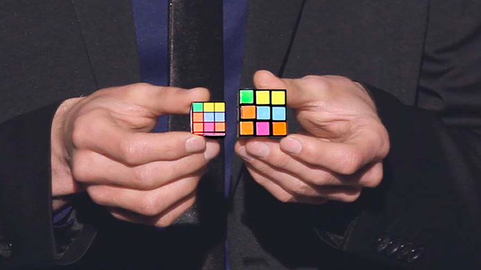 An impossible coincidence between a small paper cube and a Rubik's Cube mixed by a spectator.