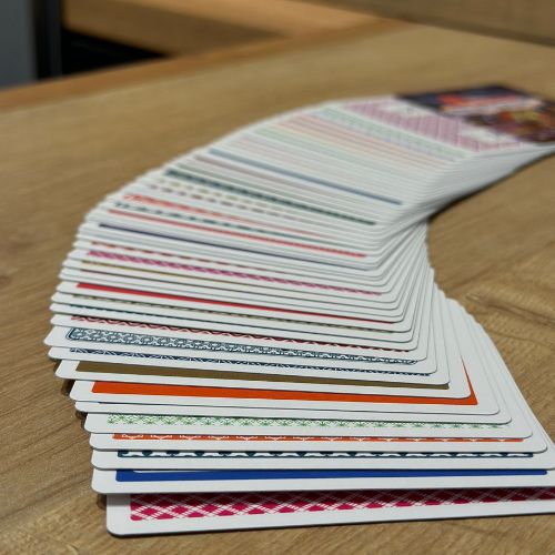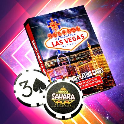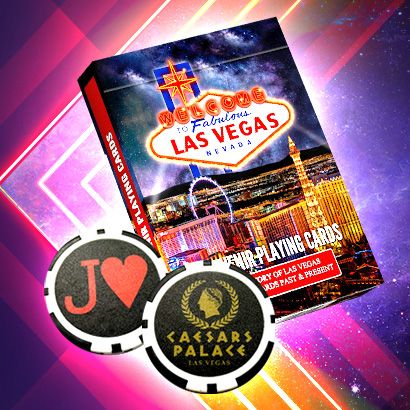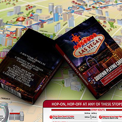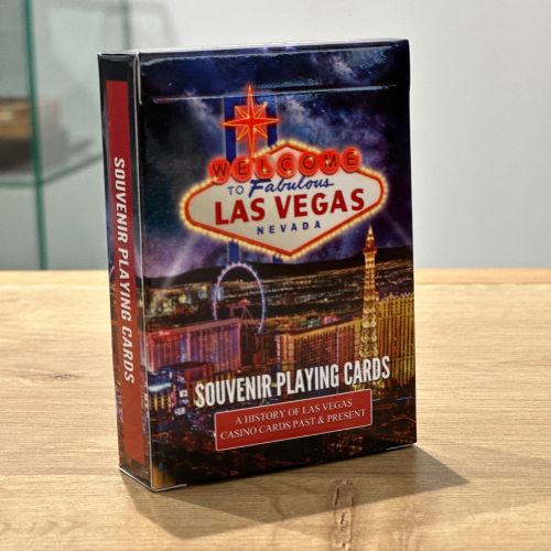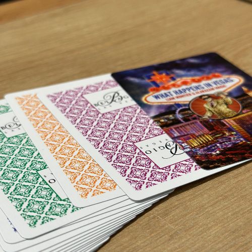 Un jeu de cartes de casino de Vegas est montré. Chaque carte a un dos différent représentant un casino différent et a une face différente.