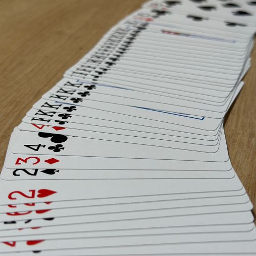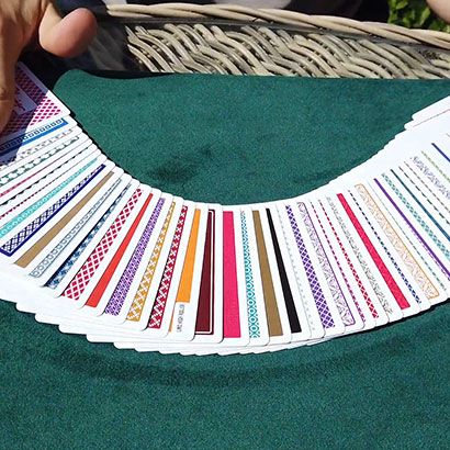 Votre spectateur est invité à vous arrêter à tout moment lorsque vous commencez à distribuer les cartes en tas sur la table (il a le libre choix de l'endroit où il s'arrête). Disons qu'il vous arrête au casino Bally. Vous retournez alors le jeu de cartes et commencez à distribuer un tas face visible sur la table (disons que votre spectateur vous arrête sur le 7 de pique).