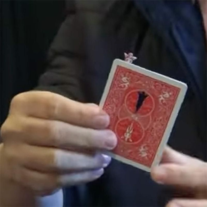 Le magicien montre le dos d’une carte. En un instant, l’un des anges Bicycle, imprimé sur le dos, disparaît du centre pour réapparaître sur le bord supérieur ! Le magicien tente de l’attraper avec ses doigts, mais l’ange s’échappe de l’autre côté !