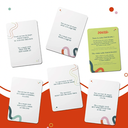 « Faites un tour les yeux fermés », « Toute la table doit participer au tour de magie », « Quelque chose chauffe », ... À travers tous ces défis, progressez dans l'art de l'improvisation. Un jeu dans lequel chaque magicien peut à tour de rôle tirer une carte et participer au jeu ! De plus, les cartes sont en français et en anglais, vous n'avez donc aucune excuse pour ne pas emporter ce jeu lors de vos conventions de magie !