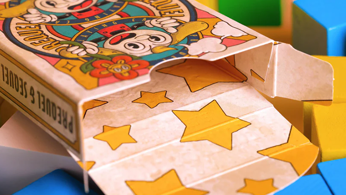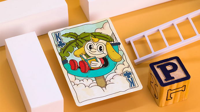 Chaque dos de carte présente une illustration en miroir, à double sens, représentant notre protagoniste en buste, encadrée dans un anneau, faisant écho à la séquence de clôture caractéristique de nombreux dessins animés de l'âge d'or de l'animation.