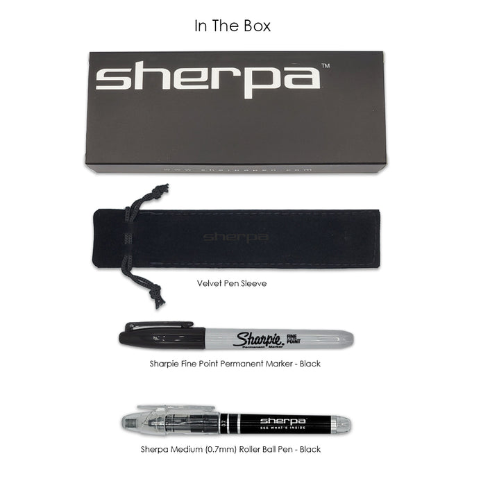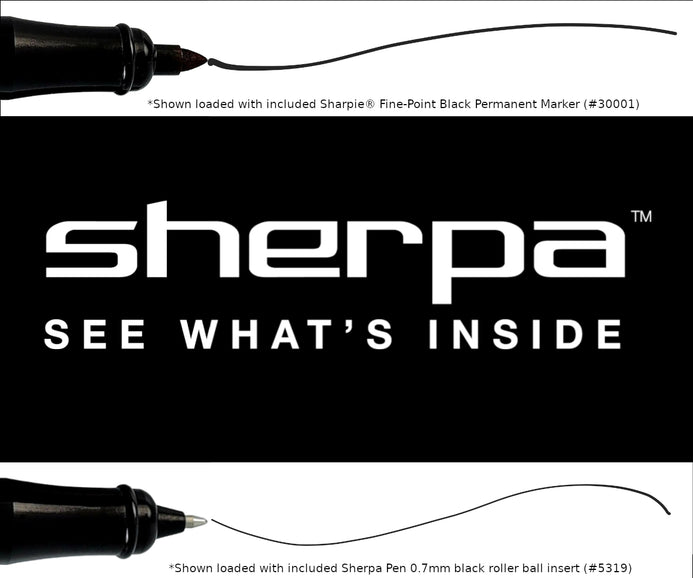 Sherpa est compatible avec plusieurs types de marqueurs populaires (Sharpie, uni-ball Vision, Pilot Pen, etc.). Lorsqu’une recharge est vide, il suffit de la remplacer : l’étui reste, le style perdure.