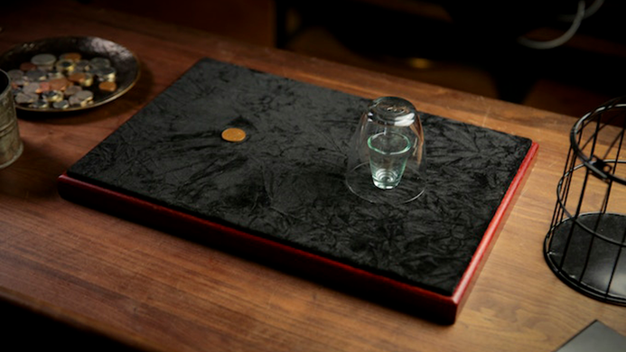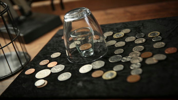 Une pièce de monnaie, signée par un membre du public, disparaît, puis se téléporte soudainement et apparaît entre deux verres en un instant, accompagnée du bruit des pièces de monnaie comme si elles tombaient de l'air.