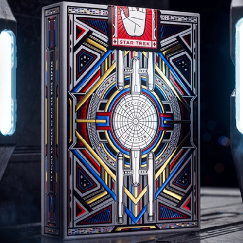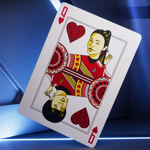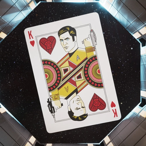 Les cartes à jouer Star Trek présentent des illustrations entièrement personnalisées dans tous les aspects de leur conception. Les As, les Jokers, les figures et le dos s'inspirent des personnages et des événements préférés des fans. L'étui est orné de feuilles d'aluminium colorées et d'un gaufrage complexe.