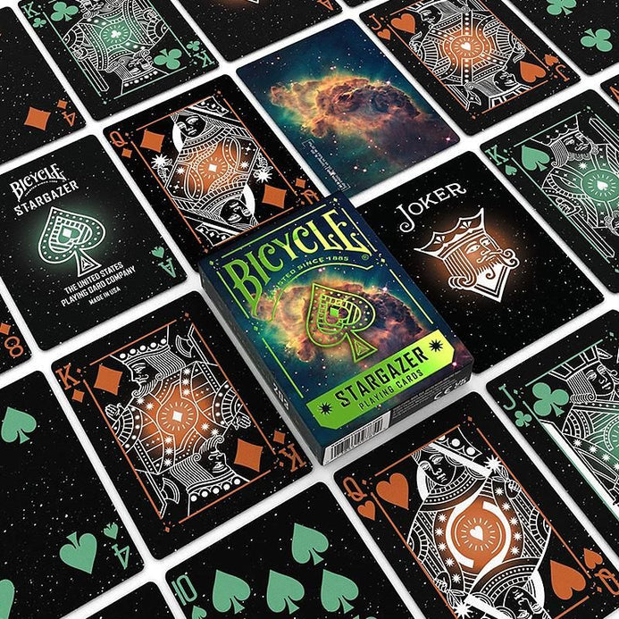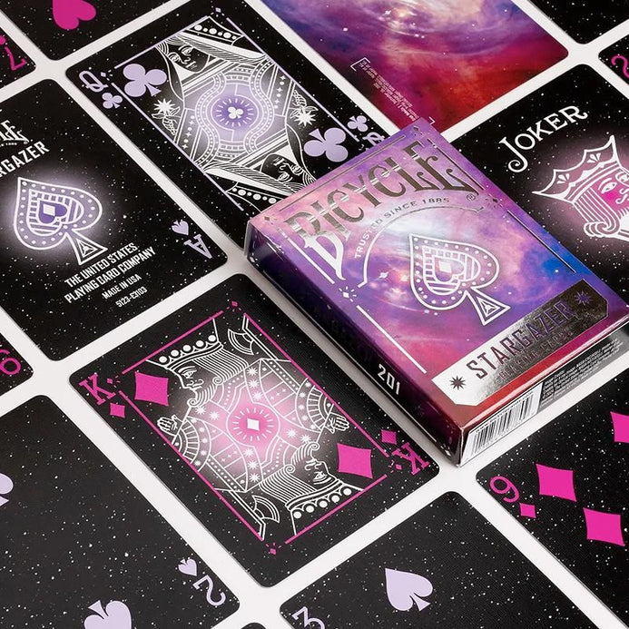 The Bicycle Stargazer Observatory Playing Cards are the latest addition to the Stargazer Bicycle collection on the space theme. The design of the Bicycle Stargazer Observatory Bicycle Cards was inspired by constellations and sacred geometry. The box and the back of the card present the shades and colors of the depths of the galaxy. Like the rest of the Stargazer collection, this game includes superior quality aluminum packaging on withdrawal, highlighting magnificent silver aluminum accents. The faces of the cards have complex personalized seeds and contrasting combinations to facilitate the playability of your favorite card games. The Stargazer series was a favorite playing card among cardists because of its fascinating conceptions which improve all development, spring or maneuver. The series is a favorite among collectors for beautiful art and the mysterious astronomical theme. The Bicycle Stargazer Observatory Bicycle Playing Cards are printed on high-end Bicycle® brand cardboard paper with Air-Cushion® finish, these cards mix and handle perfectly with the quality and performance you expect from the Bicycle brand.
