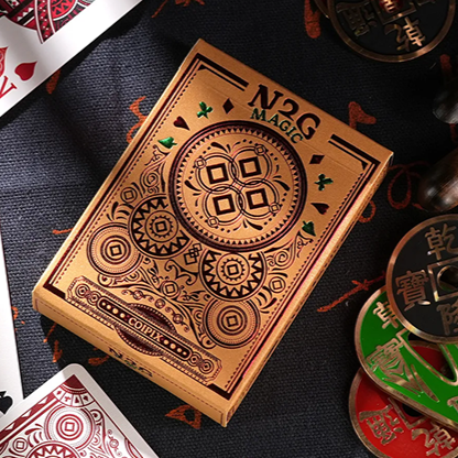 The deck merges craftsmanship and creativity, with coins fused into card designs, reflecting the Pixiu's wealth link. The back shows two majestic coin-forged Pixiu, their eyes and gills made of ancient coins, supporting a "prosperity coin." Card suits are embedded in corners, contrasting with the Pixiu's fluid, coin-covered bodies. Shuffling invokes centuries of wealth and legend.